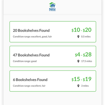 Each collection of items represents a different store associated with that nonprofit. Information such as the number of items, price range, the range of the condition, and store location are displayed to better help users make decisions.